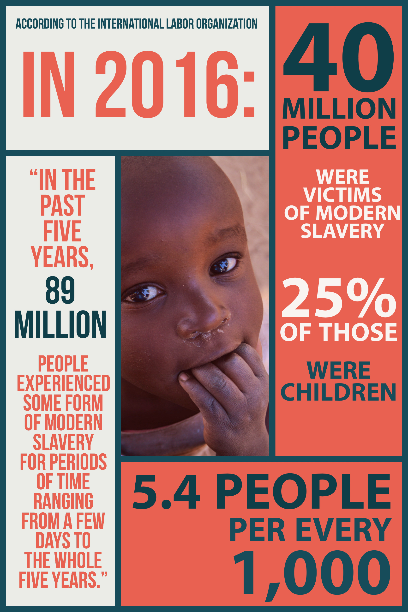 - “In the past five years, 89 million people experienced some form of modern slavery from periods of time ranging from a few days to the whole five years.”